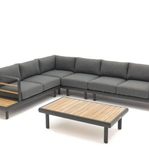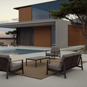 - Namještaj za terase: Za natkrivene terase preporučujemo veće lounge garniture, niske stoliće i udobne tapecirane garniture jer su zaštićene od vremenskih uvjeta i stoga zahtijevaju manje održavanja. Namještaj od drva ili metala je odličan izbor jer donosi toplinu i izdržljivost. Tapecirani proizvodi s UV-otpornim jastucima omogućuju udobnost, a dodaci poput svjetiljki i sjenila pomažu u stvaranju ugodnog prostora.